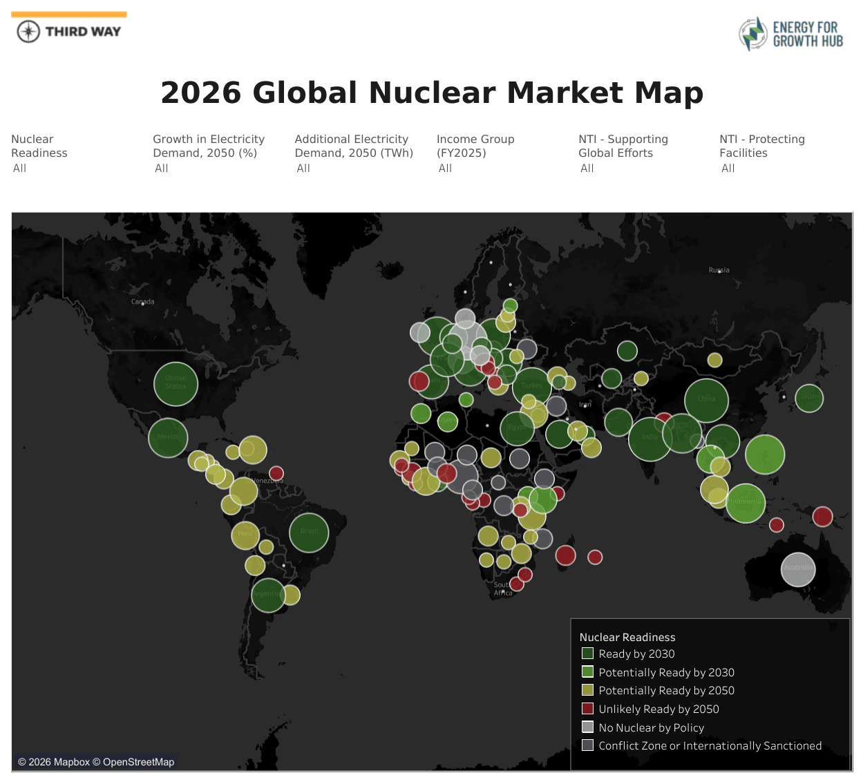 The Hub teamed up with Third Way to release the latest update to their map of the global market for advanced nuclear, tracking both the readiness of country markets for advanced nuclear and projected energy needs out to 2050. This map builds on the 2020, 2021, 2022, 2024 versions of the map with the most recent data and brand-new analysis.