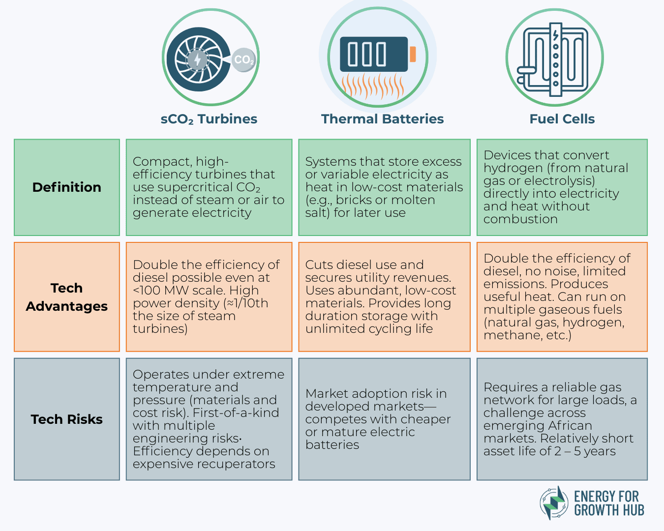 Ultimately, fixing Africa’s electricity grids remains the most consequential solution, but it is unlikely to happen quickly or uniformly. In the meantime, industrial firms need captive power options that (1) are more efficient, (2) support energy-intensive operations, (3) integrate with — or transition to — reliable grid power over time, and (4) align with national environmental and energy-transition goals. The United States leads on three next-generation technologies well-suited to these needs. These technologies are not yet fully mature and still face high investment and other early-stage costs, but they can substantially reduce imported diesel use and deliver strong long-term benefits, as grid improvements continue.